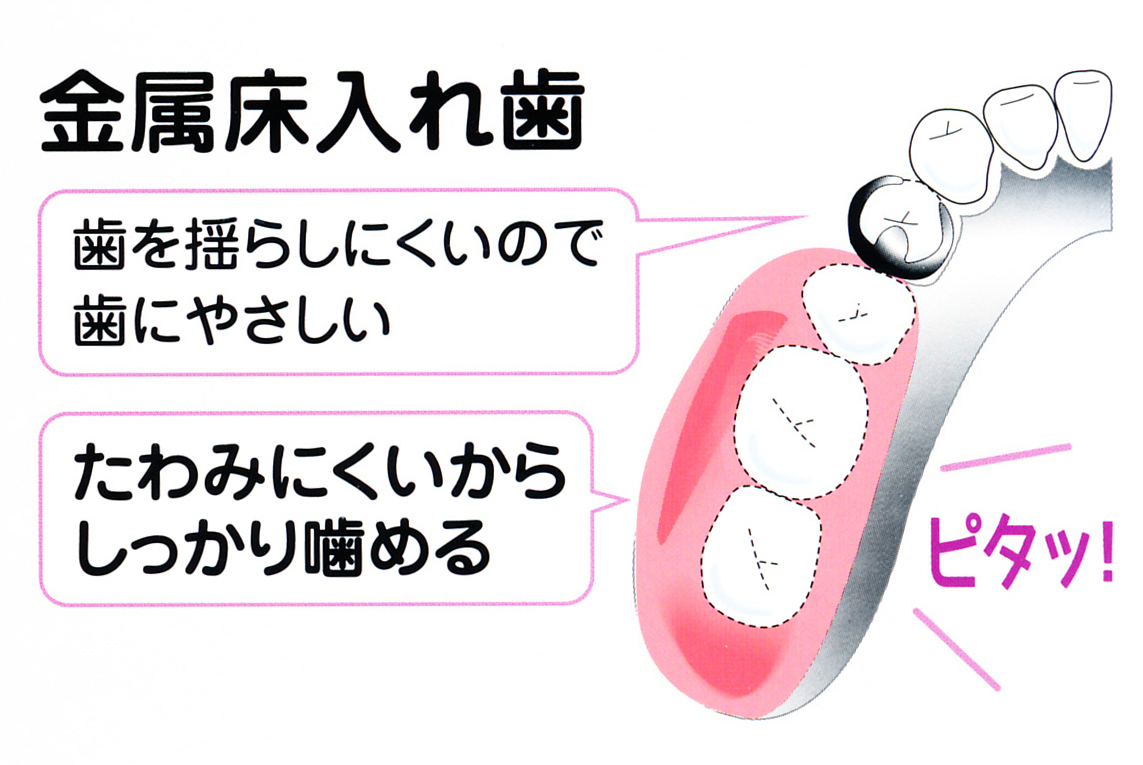 プラスチックに比べて丈夫な素材である金属を使うため、快適で、たわみにくく、丈夫な入れ歯を作ることが可能になります。